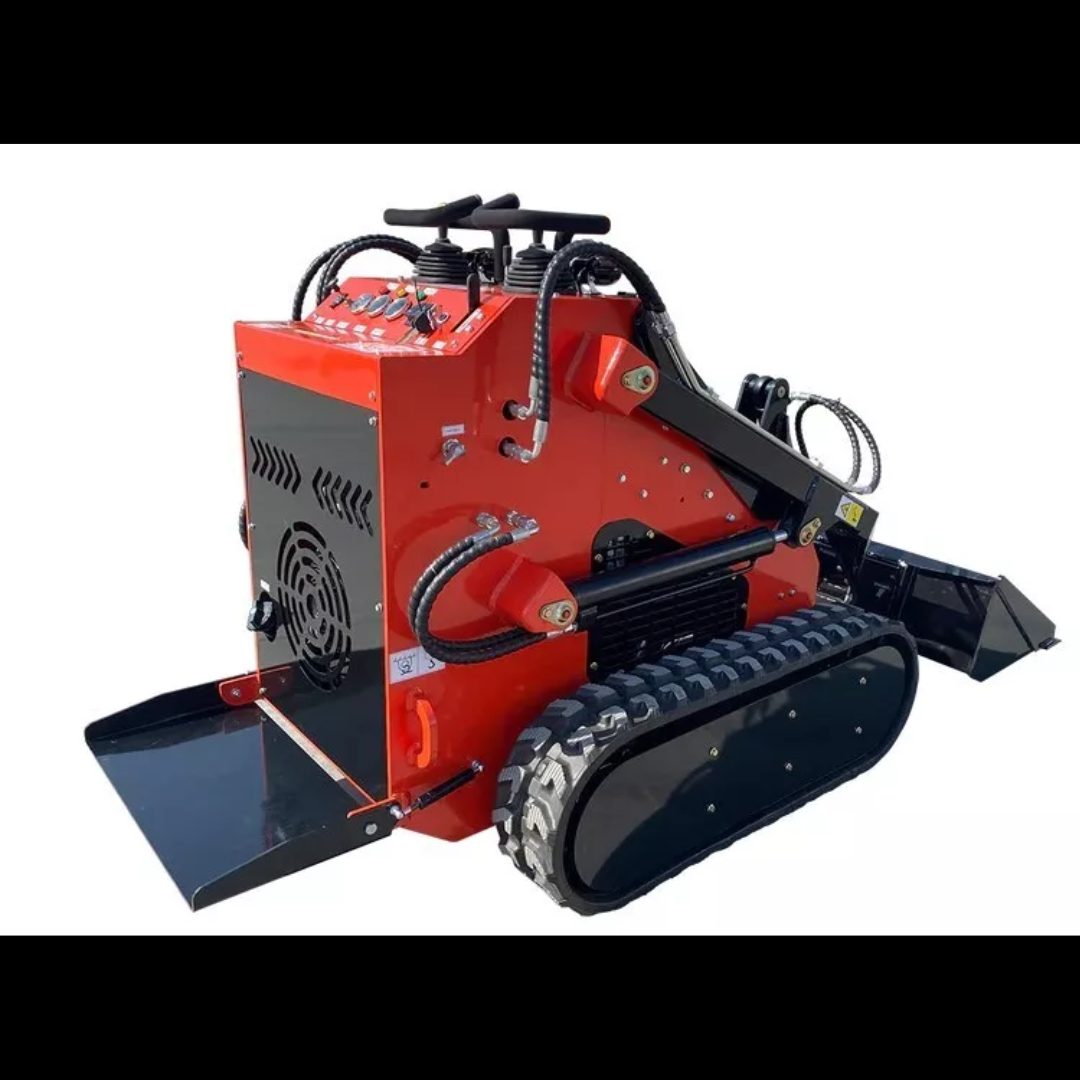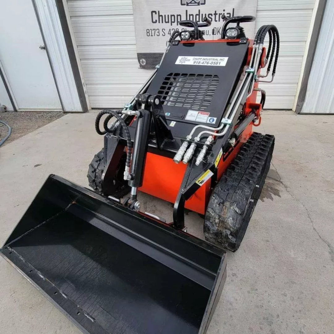 The skid steer has a 36-inch wide bucket and is compatible with Toro Dingo mini skid steer attachments. We also offer a range of attachments, including grapples, pallet forks, augers, and brooms, designed specifically for this machine. Tested with a 200 lb operator, the maximum lift capacity is 825 lbs at 2 feet and 1008 lbs at full height, though we recommend not operating at full height with the full weight capacity for optimal performance and safety.